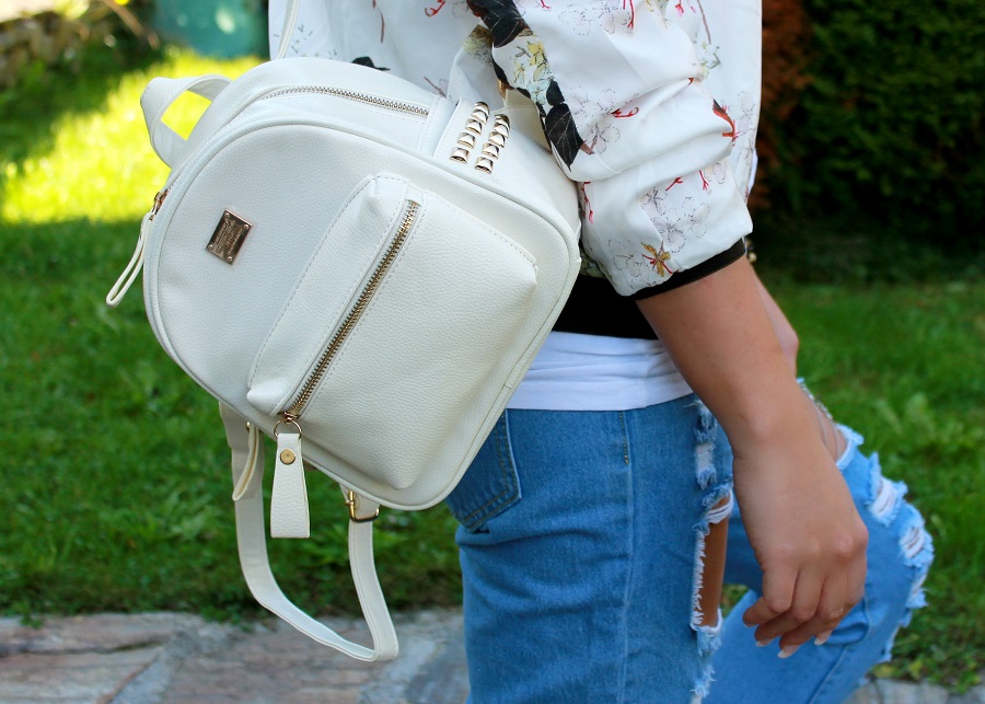 I come to you today with a simple look. Ripped jeans and a vest. To make even more interesting, I add a very light jacket and a white high heels :) instead of a purse you can see a white backpack. I love this look, its comfortable and feels really sexy!